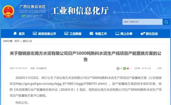 12月24日,廣西壯族自治區(qū)工業(yè)和信息化廳發(fā)布《關于撤銷崇左南方水泥有限公司日產(chǎn)5000噸熟料水泥生產(chǎn)線項目產(chǎn)能置換方案的公告》稱,2020年11月23日,我廳公告了崇左南方水泥有限公司日產(chǎn)5000噸熟料水泥生產(chǎn)線項目產(chǎn)能置換方案該產(chǎn)能置換方案因故未組織實施按照《水泥玻璃行業(yè)產(chǎn)能置換實施辦法(2024年本)》規(guī)定,現(xiàn)將崇左南方水泥有限公司日產(chǎn)5000噸熟料水泥生產(chǎn)線項目產(chǎn)能置換方案予以撤銷