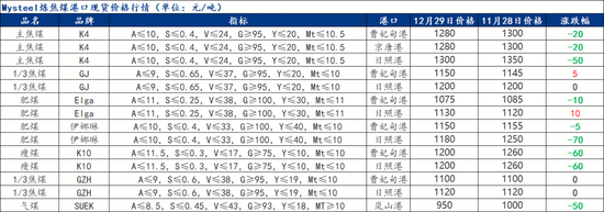 12煉焦煤震蕩偏弱運(yùn)行,各煤種價(jià)格下跌30-120元不等。其中區(qū)域性低硫主焦煤保持堅(jiān)韌,價(jià)格超預(yù)期下跌后反彈100元,以穩(wěn)運(yùn)行為主。競拍市場存在部分品種震蕩反彈,總體來看,仍是跌多漲少。配焦煤繼續(xù)下跌,部分礦點(diǎn)庫存壓力較大,疊加市場買貨積極性較弱,以降價(jià)出貨為主。