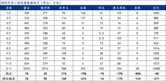 據(jù)海關(guān)總署最新數(shù)據(jù)顯示,11月中國進(jìn)口煉焦煤1073萬噸,環(huán)比增1.31%,增長幅度為14萬噸;同比降12.69%,降幅157萬噸。2025年1-11月份,中國進(jìn)口煉焦煤總量10485萬噸,同比下降5.67%,降幅671萬噸。