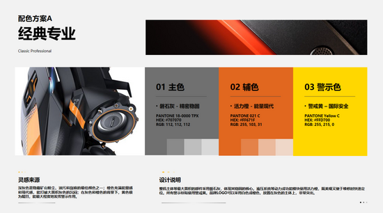 輔色活力橙的加入,為工業(yè)產(chǎn)品注入靈動生機。其色彩參考PANTONE 021 C,HEX:#FF671F,RGB:255, 103, 31。充滿能量感與現(xiàn)代感的橙色,不僅打破了大面積灰色可能帶來的沉悶感,讓設(shè)備更具活力與技術(shù)質(zhì)感,更承擔(dān)著功能區(qū)分的重要作用 —— 將應(yīng)用于電機罩、液壓站外殼等非核心結(jié)構(gòu)件,使設(shè)備結(jié)構(gòu)層次分明,便于操作與維護。