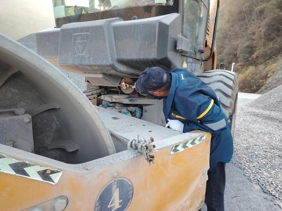 今年5月,藍(lán)山縣一臺(tái)RP953T攤鋪機(jī)在狹窄縣道突發(fā)故障。接到求助時(shí)已近傍晚,陳猛沒有絲毫猶豫,立即驅(qū)車400多公里,晚上9點(diǎn)趕到現(xiàn)場。診斷發(fā)現(xiàn)左右減速機(jī)制動(dòng)片燒死后,他連夜拆除問題部件,解除制動(dòng)系統(tǒng),通宵作業(yè),確保設(shè)備第二天正常施工。