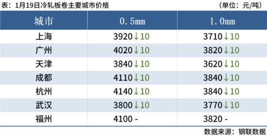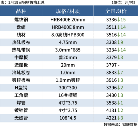 熱軋板卷:1月19日,全國24個主要城市4.75mm熱軋板卷均價3308元/噸,較上一交易日價格下跌9元/噸。春節(jié)前貿易商降庫意愿明顯,但市場商家多持觀望態(tài)度,多數(shù)報價持穩(wěn),保成交出貨為主。從供應來看,整體增產動力不足。從需求看,淡季深入,終端需求面臨逐步下行困境,市場成交仍表現(xiàn)欠佳,預計20日熱軋板卷價格或將趨弱運行