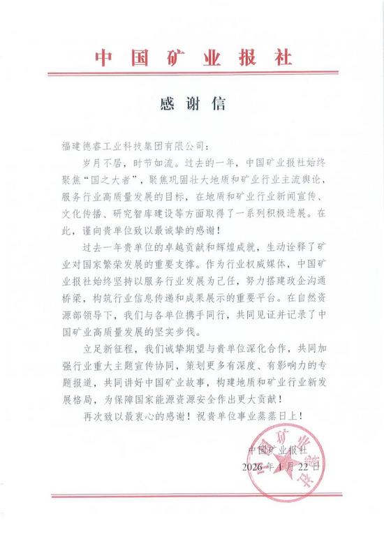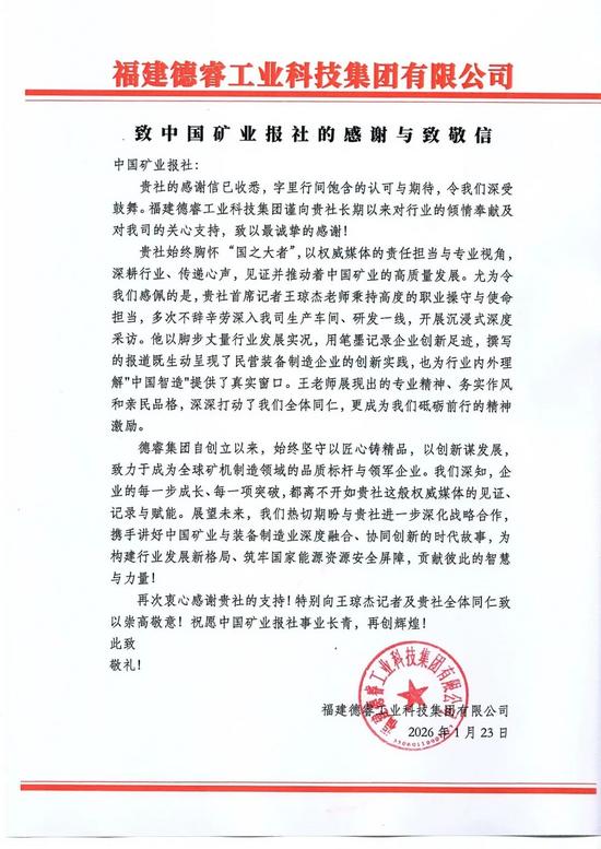 1月22日,中國(guó)礦業(yè)報(bào)社致信德睿集團(tuán),對(duì)德睿集團(tuán)在推動(dòng)行業(yè)高質(zhì)量發(fā)展中所作的貢獻(xiàn)致以誠(chéng)摯謝意。感謝信中,字里行間透露出對(duì)行業(yè)企業(yè)的深切理解:“過(guò)去一年貴單位的卓越貢獻(xiàn)和輝煌成就,生動(dòng)詮釋了礦業(yè)對(duì)國(guó)家繁榮發(fā)展的重要支撐?!毙胖刑貏e提到,期待與德睿集團(tuán)深化合作,“共同講好中國(guó)礦業(yè)故事”。
