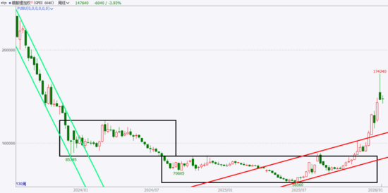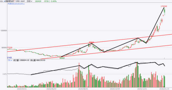 碳酸鋰價(jià)格高位回落調(diào)整202512月中旬至2026月上旬,碳酸鋰價(jià)格進(jìn)入加速上漲通道,短期暴漲至最高點(diǎn)174060噸。2026月中旬,碳酸鋰價(jià)格向下跌破157000-174000噸區(qū)間下沿,且向下跌破加速上漲通道,漲勢(shì)放緩,高位回落調(diào)整。