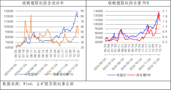 市場(chǎng)看漲情緒較強(qiáng),預(yù)期2026月至碳酸鋰價(jià)格主要在000-90000噸區(qū)間運(yùn)行。202512月中下旬以來碳酸鋰期權(quán)隱含波動(dòng)率維持中高水位震蕩,1231報(bào)收于51%從碳酸鋰期權(quán)最大持倉(cāng)量所在行權(quán)價(jià)來看,202616日,lc2603合約看跌期權(quán)最大持倉(cāng)量所在行權(quán)價(jià)為130000噸,看漲期權(quán)最大持倉(cāng)量所在行權(quán)價(jià)為190000噸,市場(chǎng)預(yù)期2026碳酸鋰價(jià)主要在130000-190000噸區(qū)間運(yùn)行。從碳酸鋰期權(quán)持倉(cāng)量來看,20251231日,看跌期權(quán)持倉(cāng)量215035手,環(huán)比減少61172手;看漲期權(quán)持倉(cāng)量142594手,環(huán)比減少137199手;看漲期權(quán)持倉(cāng)量環(huán)比大幅減少,持倉(cāng)量PCR報(bào)收于1.51,環(huán)比大幅上升0.52,遠(yuǎn)超1.0的多空分水嶺,市場(chǎng)情緒明顯好轉(zhuǎn)。