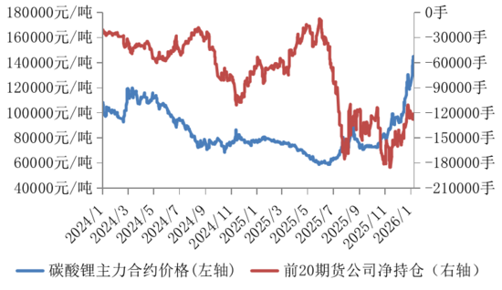 國(guó)內(nèi)主力收縮空頭敞口規(guī)模,關(guān)注產(chǎn)業(yè)資本套保安全2026日,碳酸鋰持倉(cāng)量前20期貨公司持有凈空頭120916手,在價(jià)格快速上漲過程中,較上月同期空頭敞口收縮35427手,關(guān)注產(chǎn)業(yè)資本套保安全。
