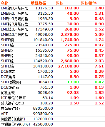 日,LME六種基本金屬價(jià)格全線上漲。三月期銅價(jià)收于13176.5美元噸,上漲1.40%。三月期鋁價(jià)收于3125.5美元噸,上漲1.31%。三月期鉛價(jià)收于1969.5美元噸,上漲0.48%。三月期鋅價(jià)收于3375.5美元噸,上漲0.90%。三月期錫價(jià)收于49098美元噸,上漲5.09%。三月期鎳價(jià)收于17349美元噸,上漲1.52%