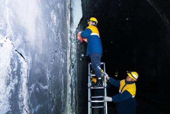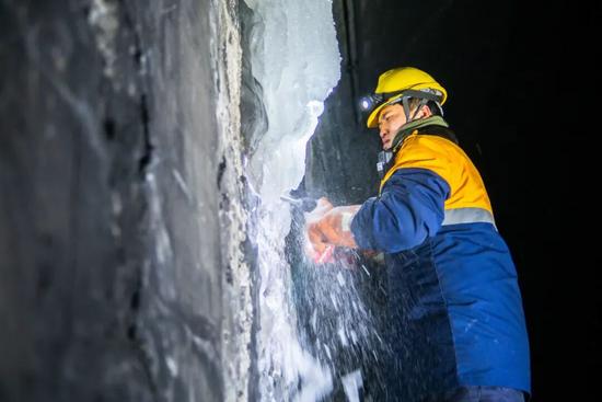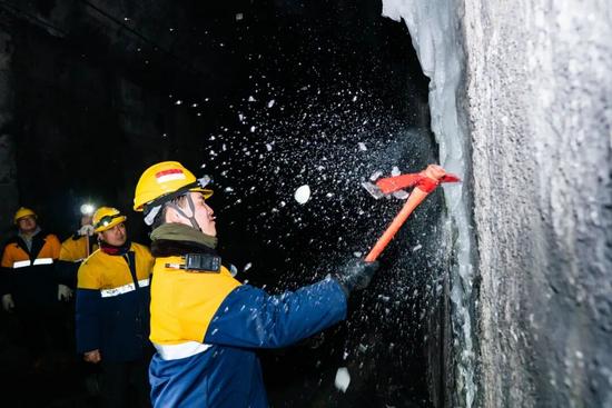 步行至隧道498米處,沿著結(jié)冰點望去,一道“冰瀑”從隧道縫隙間傾瀉而出。23歲的隋佳碩聽從指揮,迅速拿起除冰鎬鑿向冰柱。鎬尖砸在厚實的冰層上,瞬間崩裂出細碎的冰碴。