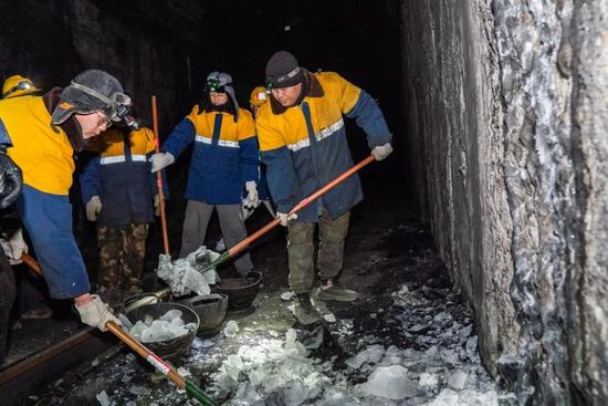 “受低溫影響,山體滲水會在隧道壁凝結(jié)成冰柱,影響供電設(shè)備和行車安全。我們今天的主要任務(wù)就是隧道除冰?!?7歲的劉鵬偉在漆黑的隧道中冷靜指揮,頭燈的亮光將隊員的身影映在側(cè)壁上,如青松般挺拔。