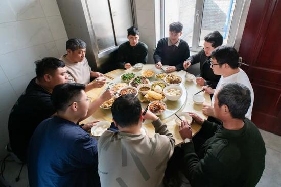 回到工區(qū),大家脫下防護裝備,汗水浸濕的頭發(fā)緊貼額頭。一陣飯香從小廚房傳來,除了酸菜燉排骨、紅燒魚等葷菜,隊員們從家里帶來的腌菜已經(jīng)擺上桌。大家商量飯后一起貼窗花,分享著春節(jié)期間的計劃。