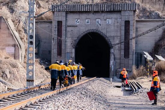 中國鐵路北京局集團有限公司承德工務(wù)段隆化線路車間金溝屯線路維修工區(qū)青年打冰隊全副武裝,在工長劉鵬偉的帶領(lǐng)下,帶著打冰桿和鋰電電錘等除冰工具,深入全長5848.3米的紅旗隧道。