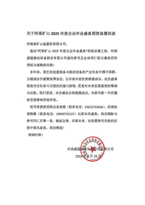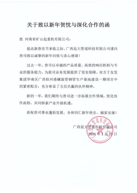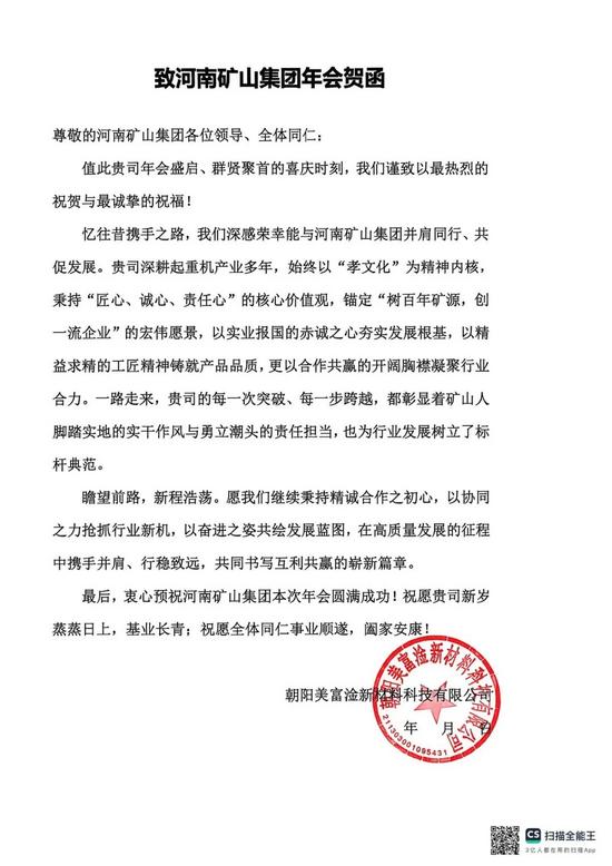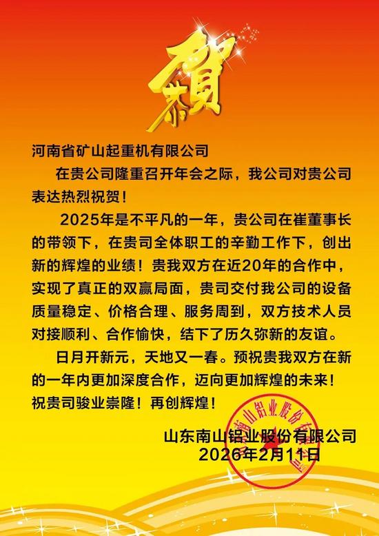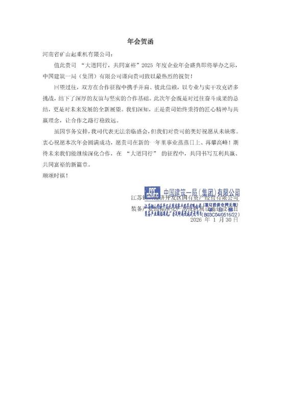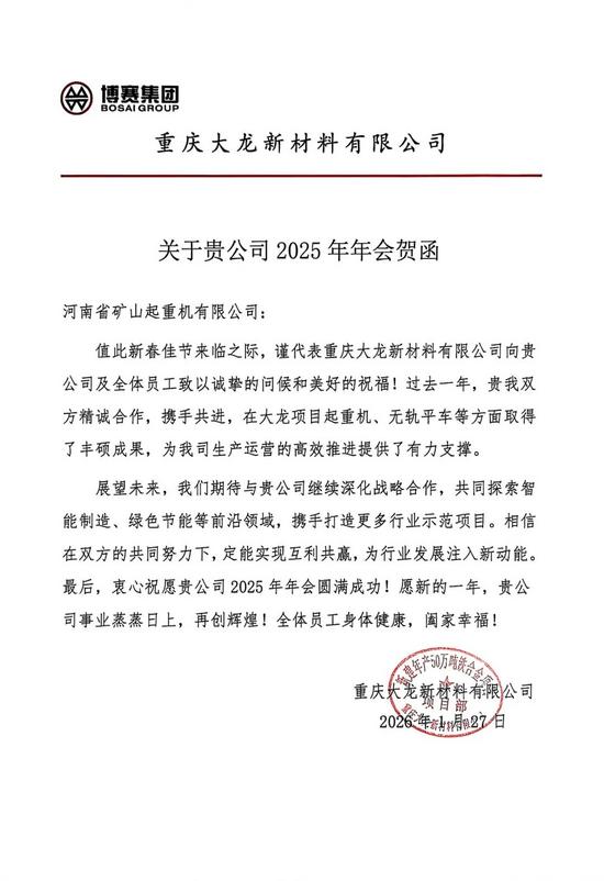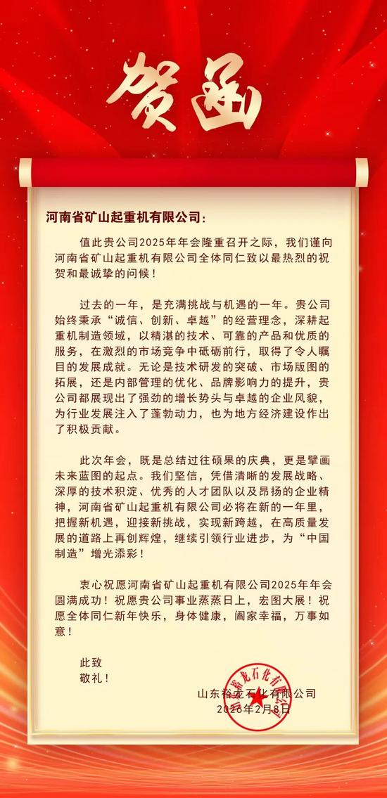 大道同行,共同富裕。值此辭舊迎新之際,河南礦山2025年度企業(yè)年會盛典即將隆重啟幕。各合作單位紛紛致賀,預祝盛會圓滿舉行、共贊企業(yè)發(fā)展成就。