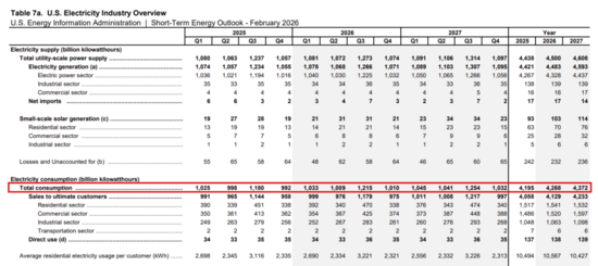 展望2026-2027年,美國電力需求預(yù)計(jì)強(qiáng)勁增長。EIA發(fā)布的2026年2月份短期預(yù)測(cè)中,2026年電力消費(fèi)從2025年的4195太瓦時(shí)(TWh)升至4268TWh,2027年進(jìn)一步達(dá)4372TWh。驅(qū)動(dòng)因素包括AI數(shù)據(jù)中心和供熱、交通電氣化數(shù)據(jù)中心需求可能從2023年的176TWh升至2028年的325-580TWh,占全國總用電量的6.7%-12%。