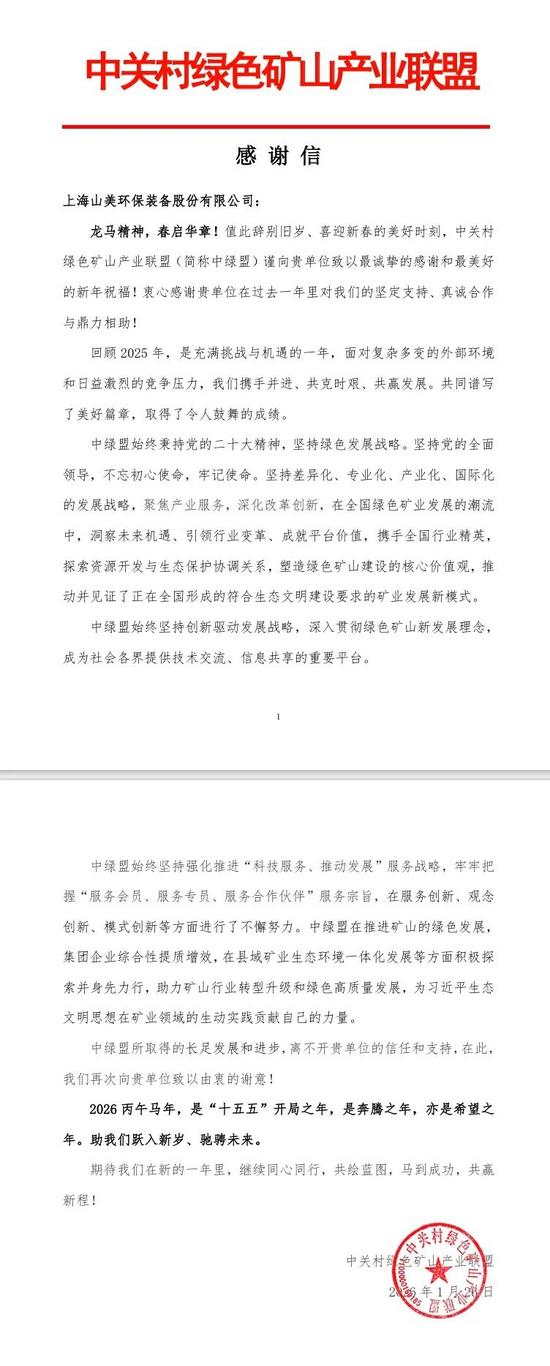 近日,上海山美環(huán)保裝備股份有限公司收到來(lái)自中關(guān)村綠色礦山產(chǎn)業(yè)聯(lián)盟(以下簡(jiǎn)稱“中綠盟”)的感謝信,表達(dá)對(duì)過(guò)去一年中雙方真誠(chéng)合作、鼎力支持的誠(chéng)摯謝意,并送上新春的美好祝福。