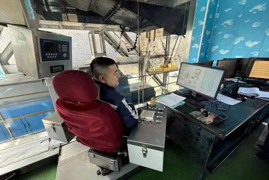 2月12日,鄂爾多斯準格爾旗華電不連溝煤礦的裝車塔上,裝車員薛海濱已坐上操作臺,身旁右側(cè)顯示屏上,煤炭進入緩沖倉的比例清晰可見?!班帧碧崾疽繇懫?,定量倉內(nèi)煤炭已達到裝車標(biāo)準,薛海濱拿起對講機向列車司機發(fā)出信號,風(fēng)笛聲劃破清晨,105節(jié)車廂的萬噸煤炭大列裝車工作正式啟動。